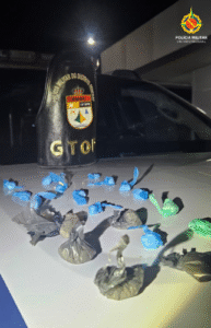 Durante a abordagem e busca veicular, os militares localizaram um pacote contendo 21 papelotes de tamanhos variados, com substância em pó branco semelhante à cocaína, já embalados para o comércio ilícito. Também foi encontrada uma faca na porta do lado do motorista.