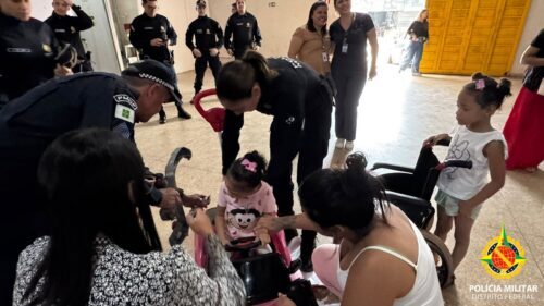 A solenidade contou com a presença da cúpula da PMDF, incluindo a Comandante-Geral, Coronel Ana Paula, que realizou uma entrega especial a uma criança com deficiência, simbolizando o cuidado e a atenção da Corporação. Em conversa com os participantes, a Comandante-Geral ressaltou a importância da colaboração: “A gente está aqui com vários policiais que colaboraram para que a gente fizesse uma entrega de Natal para vocês hoje.” Ela também fez questão de parabenizar os funcionários, professoras e instrutoras pelo trabalho voluntário e dedicação ao projeto.