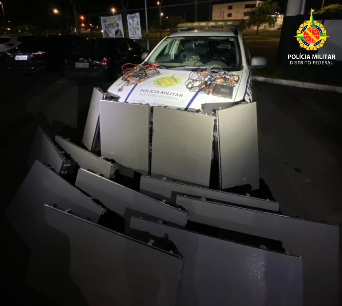 Ao todo, foram recuperados 12 painéis de LED e dois computadores, além da apreensão do veículo utilizado na ação. O prejuízo evitado é estimado em aproximadamente R$ 60 mil. A ocorrência foi registrada como furto e segue sob apuração.